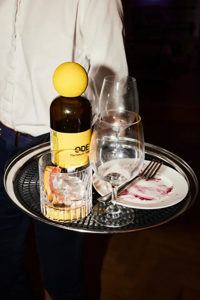 Bunt war gestern. ODE steht in einer klaren Designflasche aus recyceltem Glas – mit Holzkugel als Verschluss. Ein Aperitif, der nicht nach Plastikbecher aussieht, sondern nach Tischkultur.